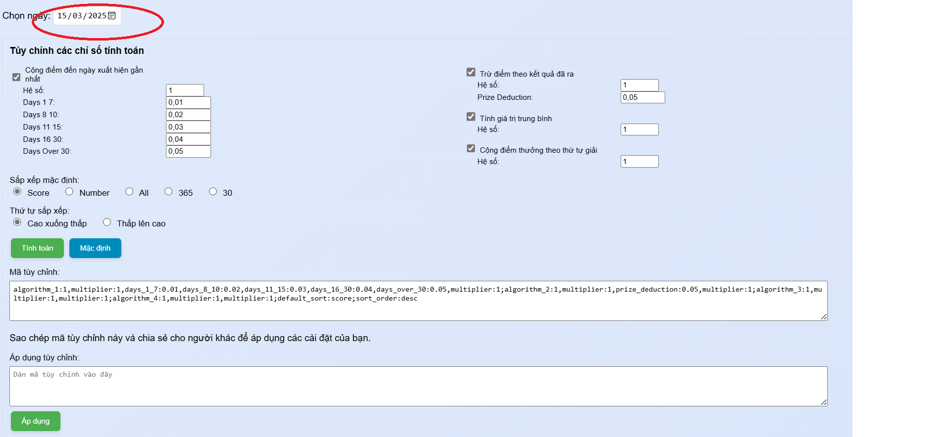 Ô mã tuỳ chỉnh, là khi bạn chọn sửa đổi các số trong thuật toán, nó sẽ lưu các giá trị tại đây, bạn có thể copy code này để lưu  lại hoặc gửi cho người khác, chia sẻ các cài đặt của bạn. Bạn có thể paste đoạn code này vào ô áp dụng mã tuỳ chỉnh và bấm áp dụng, nó sẽ setting lại toàn bộ các lựa chọn giống như lúc bạn lưu mã này lại